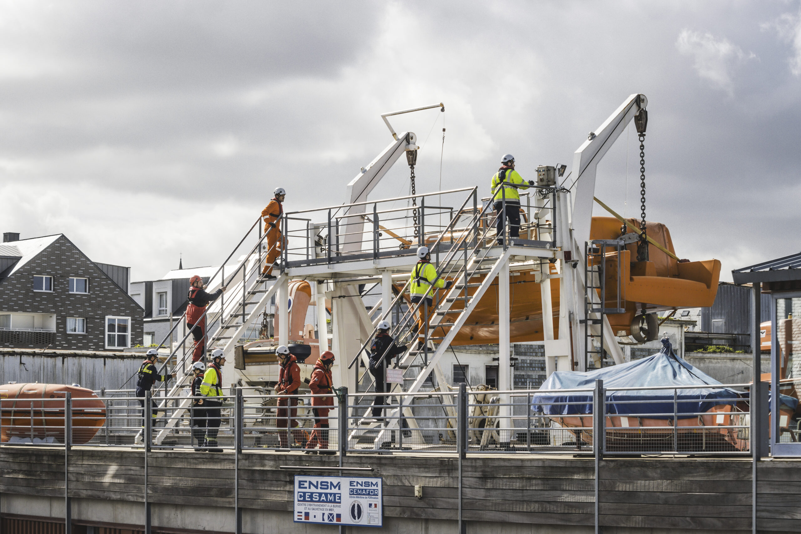 Les formations en GWO offshore se déroulent au CESAME, le Centre d’entraînement à la survie et au sauvetage en mer de l’ENSM, situé à Saint-Malo. Ce site dispose d’infrastructures modernes, conçues pour simuler des situations réelles.